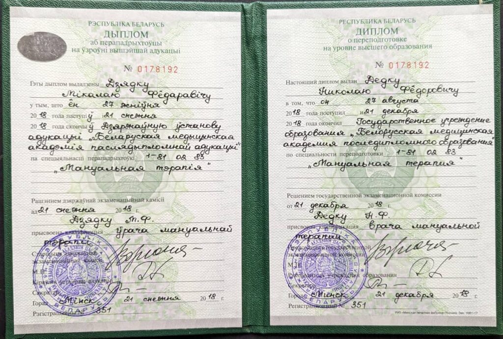 В 2018 году прошел повышение квалификации в БелМАПО по специальности переподготовки «Мануальная терапия».
