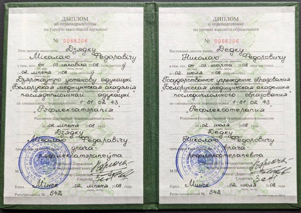 В 2008 году прошел повышение квалификации в БелМАПО по специальности переподготовки «Рефлексотерапия».
